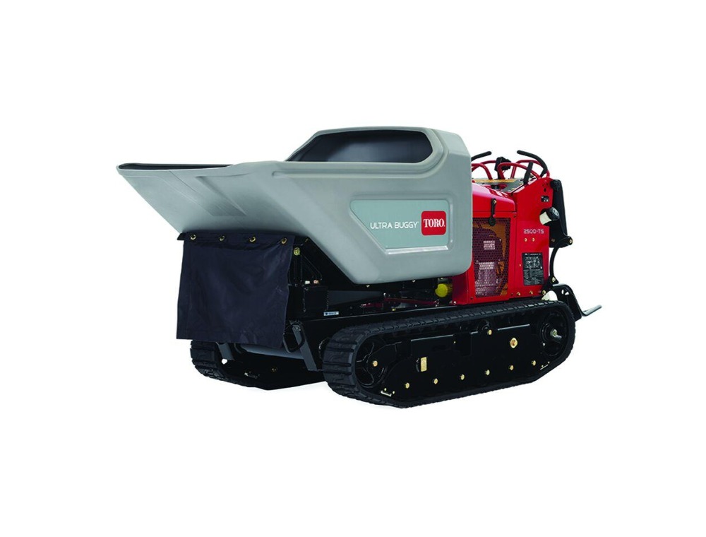 The Toro Ultra Buggy is a compact, stand-on material handler designed for transporting concrete, dirt, and gravel, featuring 2,500 lb capacity with tracks and a 16 cu ft tub. It features a 180° swivel dump, auto-return, and narrow width (approx. 35.5″) for accessing tight spaces.